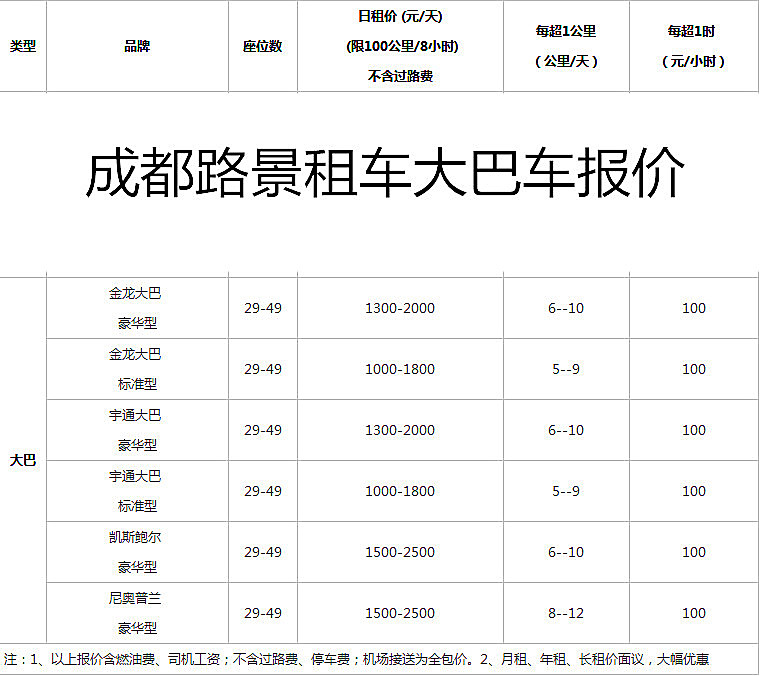此外,除了租車外,租賃大巴車時,還會產生一筆代駕費。畢竟大巴車車型龐大,需要有專業的駕駛人員操作,因此租車公司會派專業的大巴車司機進行代駕,代駕費為150~200元/天,不包括司機的食宿。